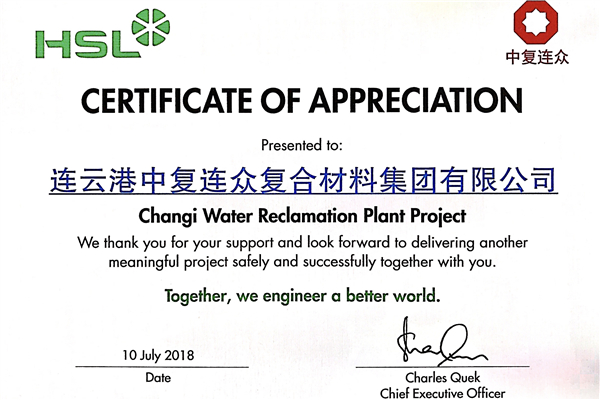 2018年7月9-11日,新加坡水處理博覽會(huì )在金沙國際會(huì )展中心舉行。展會(huì )上,HSL公司CEO Charles Quek先生向中復連眾總經(jīng)理助理、管道公司經(jīng)理楊澤平頒發(fā)了感謝證書(shū),對中復連眾在新加坡大型污水處理廠(chǎng)項目中的優(yōu)異表現表示感謝。同時(shí),HSL公司和中復連眾簽訂了長(cháng)期合作備忘錄,雙方將進(jìn)一步開(kāi)展深度合作。